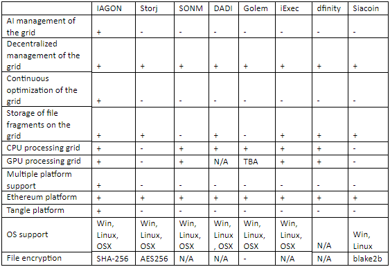 IAGON conducted this study to assess the capabilities of other crypto-token and blockchain based projects that address decentralized storage of processing, and completed their ICO or plan to do so. These projects were compared according to prominent features of cloud services, decentralized storage, processing and the existing crypto-token platforms. Data was collected and analyzed from multiple resources published by different projects: whitepapers, websites, videos, forums, project blogs, etc. Despite our efforts, no references to particular attributes of some projects were found online. We will be grateful for completing these details, including references from the originators of the projects, for the benefit of the blockchain, Big Data and AI community members.