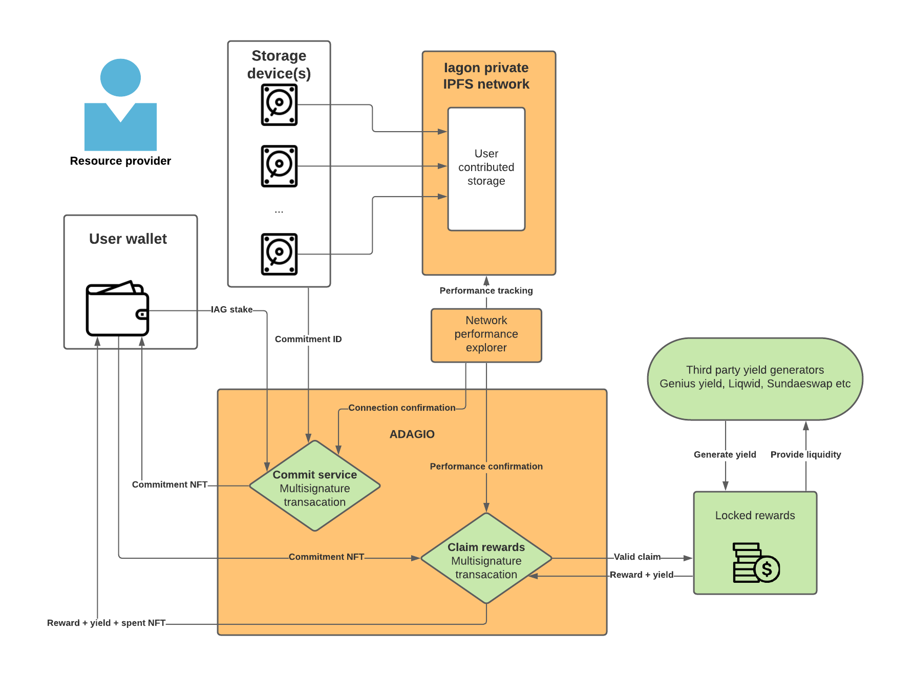 In basic terms, Adagio is responsible for the rewards model on Iagon’s platform. It calculates the rewards for staking or providing storage, tracks the performance of storage nodes, and performs operations that result in generating additional yield for the providers.