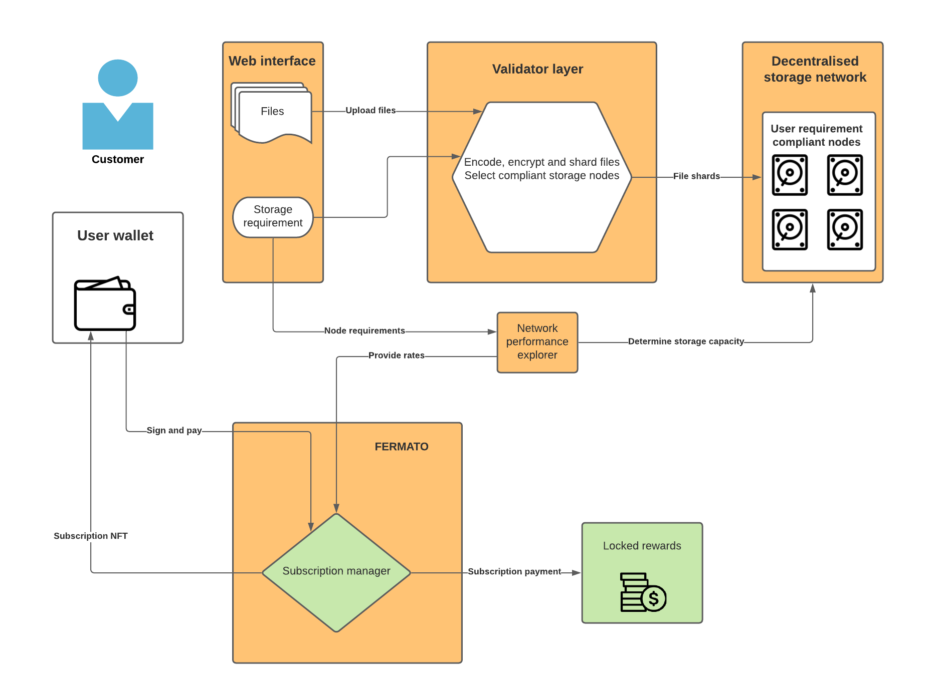 - Finally, Fermato generates a subscription proof NFT and sends the details to the storage consumer’s wallet. The process is completed, and the consumer can now upload their data. The files are encoded, encrypted, sharded, and distributed across the decentralized network of storage nodes.